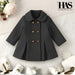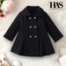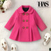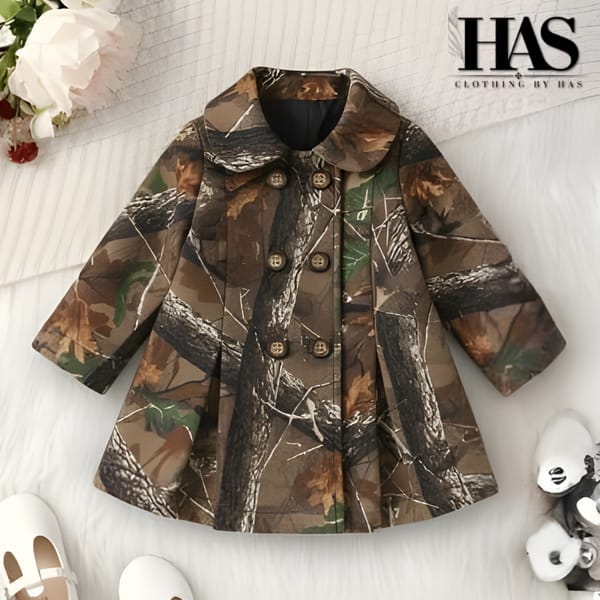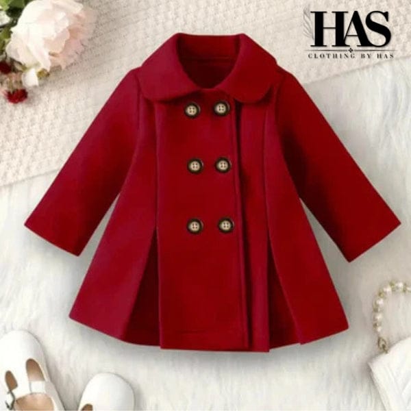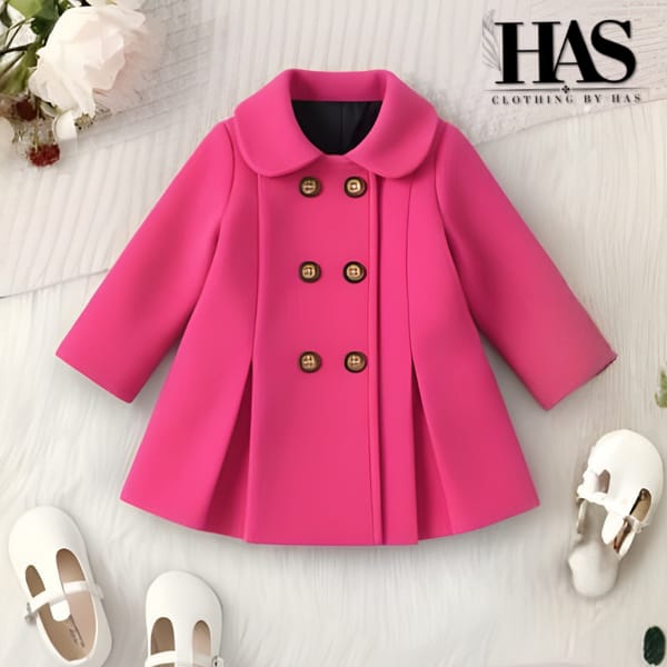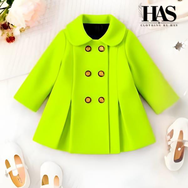 A charming baby blue coat designed with a classic and elegant silhouette. The coat features a soft rounded collar, a double-breasted front with decorative buttons, and a gently flared shape that allows comfortable movement. Made from a smooth, structured fabric, it offers warmth while remaining lightweight and easy to wear.